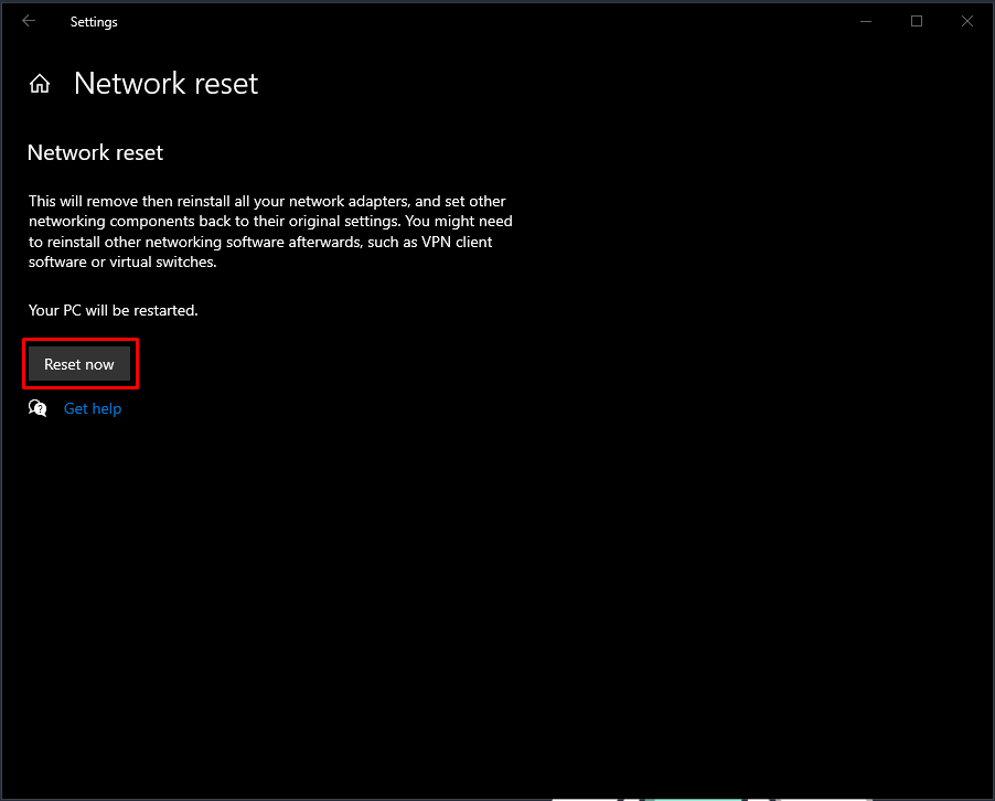 Network Reset ekranında, ağımız sıfırlandığında bize ne olacağı konusunda bilgi veriyor ve yeniden başlatmanın gerekli olacağını bildiriyor. Ağı sıfırlamak ve bilgisayarımızı yeniden başlatmak için Reset Now (Şimdi Sıfırla) butonuna tıklıyoruz.