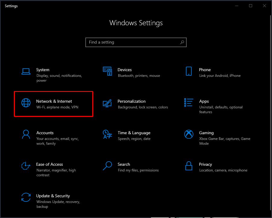 Windows Settings (Windows Ayarları)ekranında Network & Internet (Ağ ve İnternet) ayarlarına gidiyoruz.