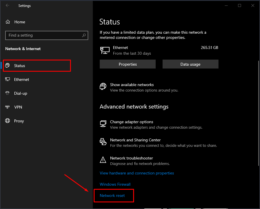 Network & Internet ayarlarına girdikten sonra soldaki menüden Status (Durum) sekmesini seçip ardından Network Reset (Ağ sıfırlama) butonuna tıklıyoruz.