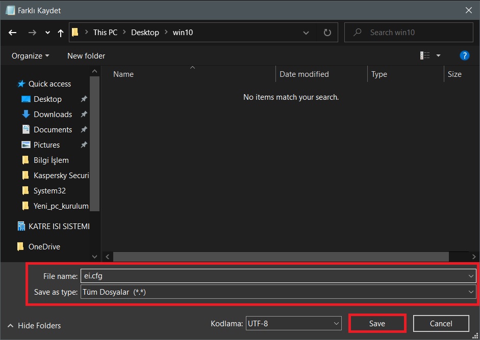 Daha sonra Farklı Kaydet seçeneğini seçip Kayıt Türünü Tüm Dosyalar seçip dosya adını ei.cfg olarak yazıp kaydediyoruz.